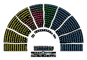 Certo non è facile capire a occhio dove finisce un gruppo e ne comincia un altro! Ecco quindi come sono raggruppati oggi i 630 deputati nell’emiciclo (così si chiamano i banchi semicircolari dell’Aula)